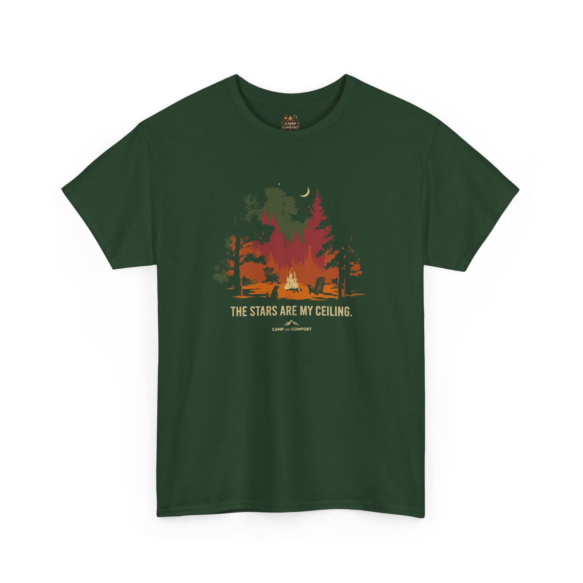This soft, breathable tee channels quiet nights in the woods — a campfire silhouette framed by trees, a crescent moon, and the line “The stars are my ceiling.” It sits relaxed on the shoulders and feels lived-in from the first wear. Slip it on after a day on the trail or pair it with flannel for a slow evening around a real or imagined fire. The print blends warm ember tones with muted greens for a vintage, outdoorsy look that ages nicely with wash after wash. Ethically grown cotton and careful construction mean it’s comfortable against skin and holds shape through repeated adventures.